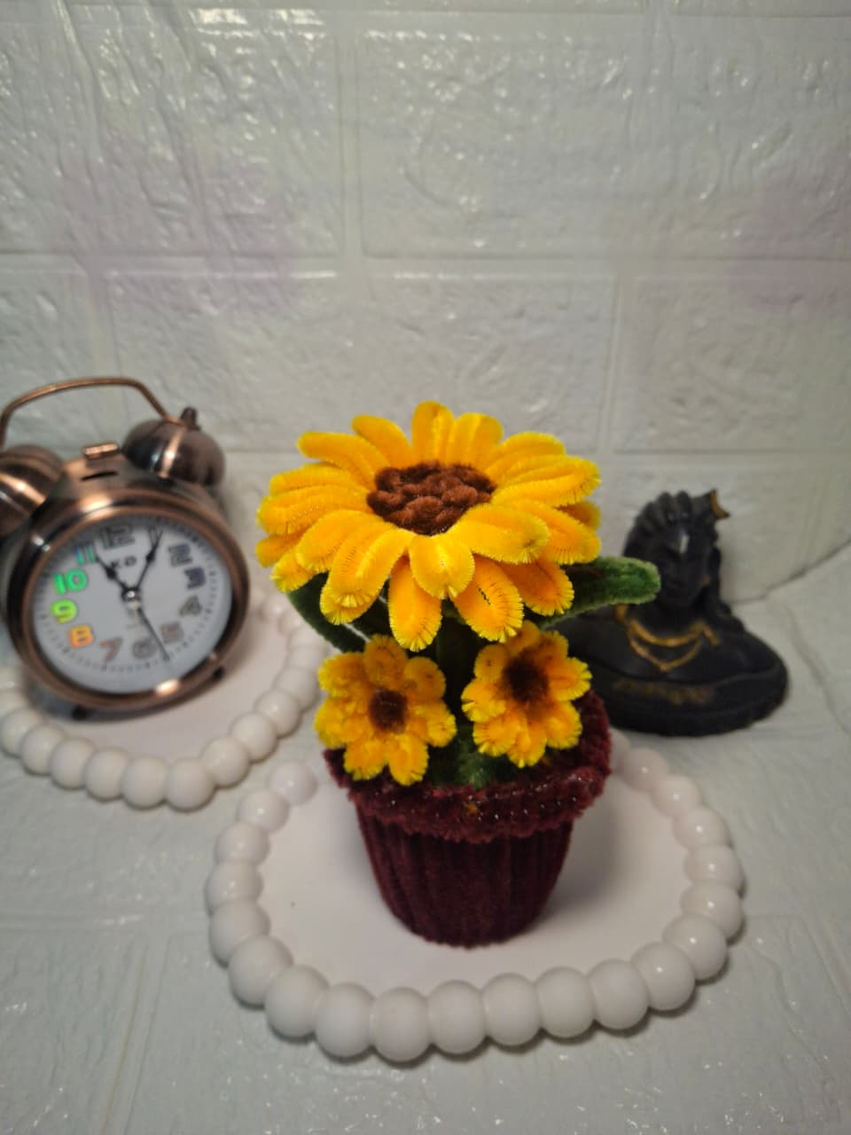 Brighten up your space with this cheerful handmade sunflower mini pot décor by Adorn by Riti. Carefully crafted using colorful pipe cleaners, this vibrant arrangement features a beautiful sunflower along with smaller blossoms, creating a lively and eye-catching decorative piece.