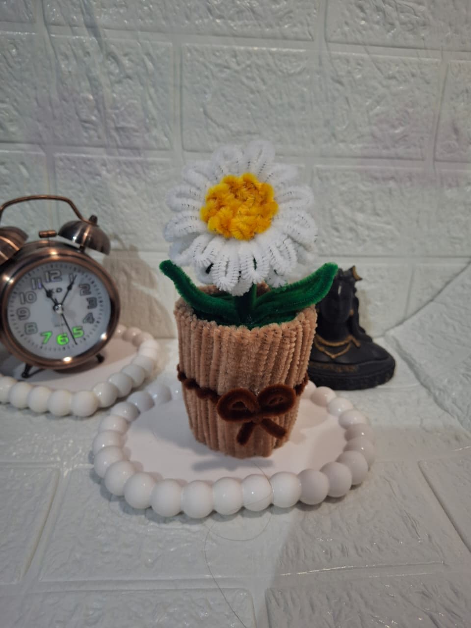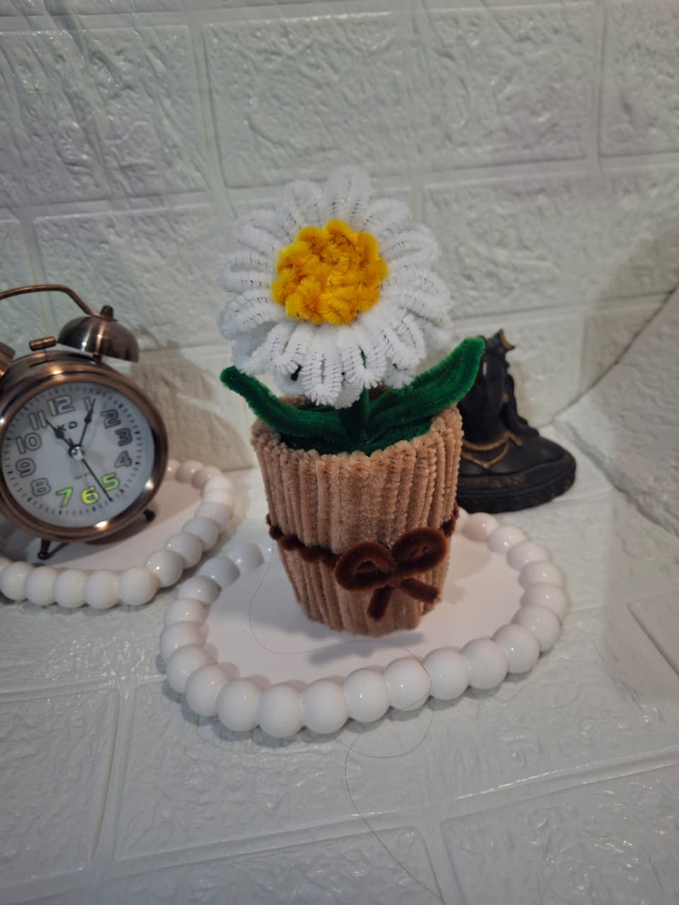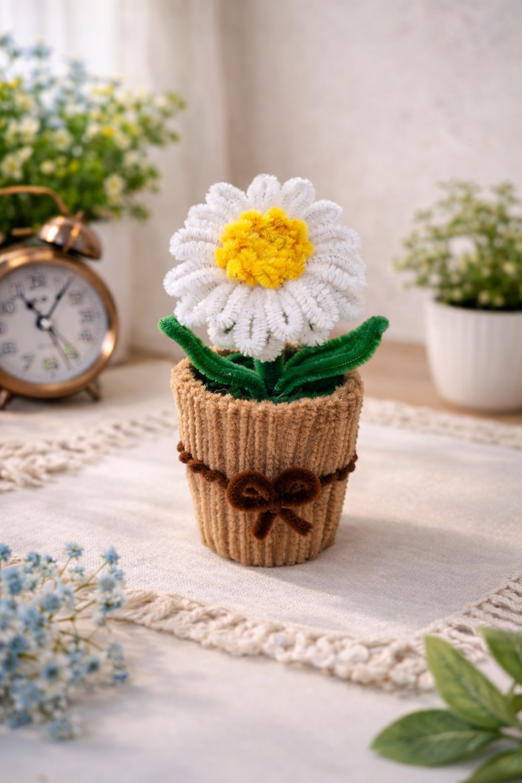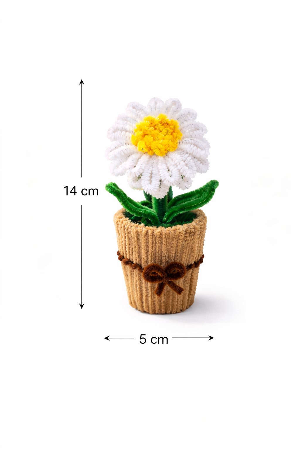 Bring a touch of freshness and elegance to your space with this handmade white daisy mini pot décor by Adorn by Riti. Carefully crafted using soft pipe cleaners, this charming floral piece features a beautiful white daisy with a bright yellow center, arranged in a textured decorative pot.